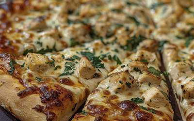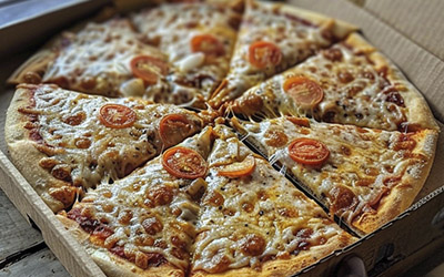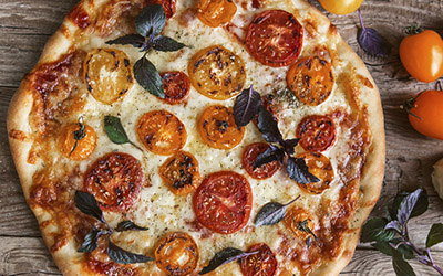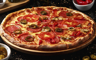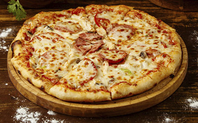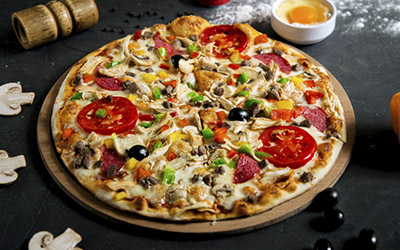 Molho de tomate, mussarela, presunto, ovos, cebola, azeitonas e ervilhas.
