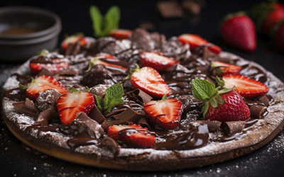 Chocolate derretido ao leite e granulado ou raspas de chocolate.